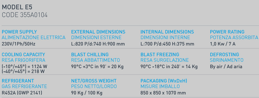 Máy làm lạnh hiệu suất Blast 90 ° C + 3 ° C = 20.0 Kg, Máy làm đông lạnh 90 ° C -18 ° C = 14.0 Kg