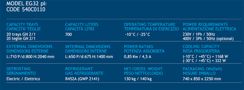 Dễ sử dụng và có hiệu suất cao hơn nhiều so với trung bình Được sản xuất hoàn toàn bằng thép không gỉ AISI 304, phòng bên trong có kích thước lớn, thiết bị bay hơi được xử lý bằng lớp phủ bảo vệ không độc hại Thiết bị điện tử hoạt động và hoàn chỉnh: Hệ thống làm lạnh vụ nổ PHẦN MỀM và HARD với bộ nhớ.