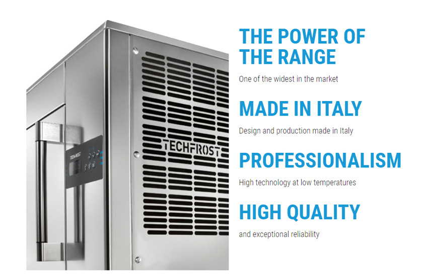 Máy làm lạnh nổ Techfrost là dụng cụ thiết yếu cho phép chế biến thực phẩm an toàn, chất lượng cao. Giảm nhanh nhiệt độ thực phẩm lõi (làm lạnh từ + 90 ° C xuống + 3 ° C trong 90 phút; đông lạnh từ + 90 ° C đến -18 ° C trong 240 phút) ức chế sự phát triển của vi sinh vật trong khi vẫn giữ được độ tươi và hương vị của mọi thực phẩm còn nguyên vẹn bằng cách chỉ để sản phẩm tiếp xúc với luồng khí gián tiếp.