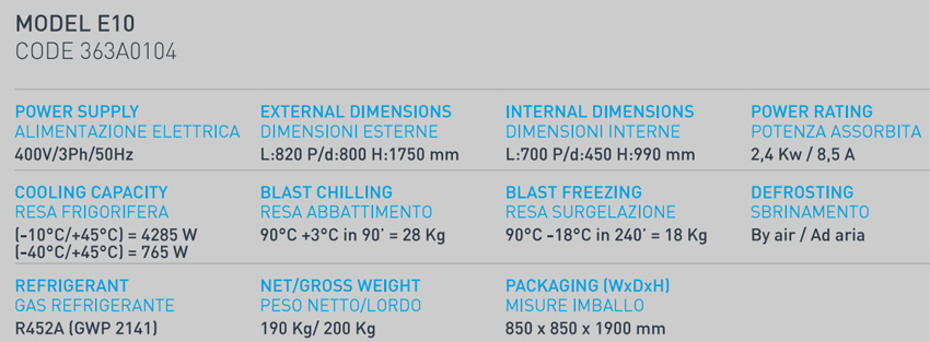 Dễ sử dụng và có hiệu suất cao hơn nhiều so với trung bình Được sản xuất hoàn toàn bằng thép không gỉ AISI 304, phòng bên trong có kích thước lớn, thiết bị bay hơi được xử lý bằng lớp phủ bảo vệ không độc hại Thiết bị điện tử hoạt động và hoàn chỉnh: Hệ thống làm lạnh vụ nổ PHẦN MỀM và HARD với bộ nhớ.