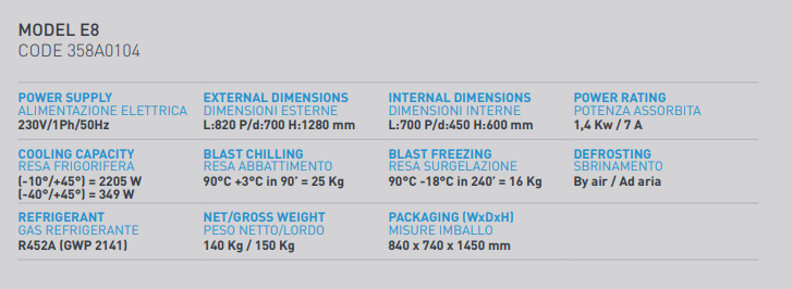 Chức năng và mạnh mẽ: được sản xuất hoàn toàn bằng thép không gỉ AISI 304, quạt powerfult, thiết bị bay hơi được xử lý với lớp phủ bảo vệ không độc hại, dễ dàng truy cập vào quạt để làm sạch hoàn toàn, cửa tự động đóng kín với miếng đệm cửa được sưởi ấm.